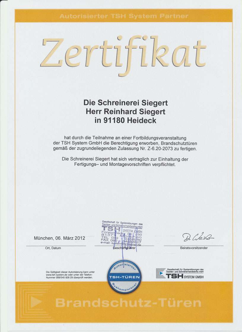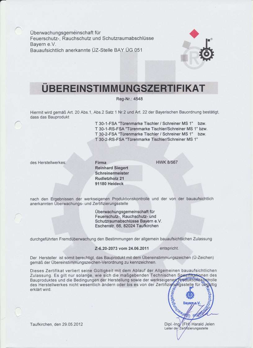 Brandschutztüren nach der allgemeinen bauaufsichtlichen Zulassung Z‑6.20‑2073 herzustellen und fachgerecht zu montieren. Zusätzlich bestätigt ein unabhängiges Übereinstimmungszertifikat der Überwachungsgemeinschaft für Feuerschutz‑ und Rauchschutzabschlüsse, dass unsere Produktion regelmäßig kontrolliert wird und alle Anforderungen der Landesbauordnungen erfüllt. Für Sie als Bauherr, Architekt oder Verwalter bedeutet das: rechtssichere Ausführung, nachweislich geprüfte Qualität und maximale Sicherheit im Brandfall – direkt vom regionalen Schreinermeisterbetrieb.
